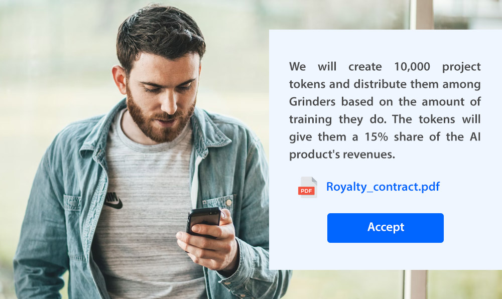 You determine the payment rules. Whether it’s a fixed fee, a bidding process by Grinders, or a custom contract based on royalties, set the terms that suit your project. Fairgrind supports royalty based projects which tokenize the AI model in order to share future revenues.